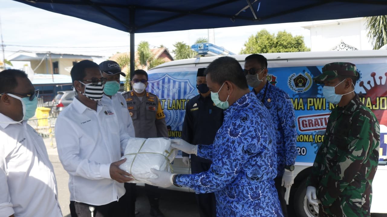 APD untuk Wartawan diserahkan Bupati saat menghadiri kegiatan pembagian 1000 Masker gratis untuk pengguna jalan raya yang dilaksanakan oleh PWI Wajo bekerja sama dengan Polres Wajo, di depan Mesjid Ummul Qura, jalan Mesjid Raya Sengkang, Jumat 17 April 2020.