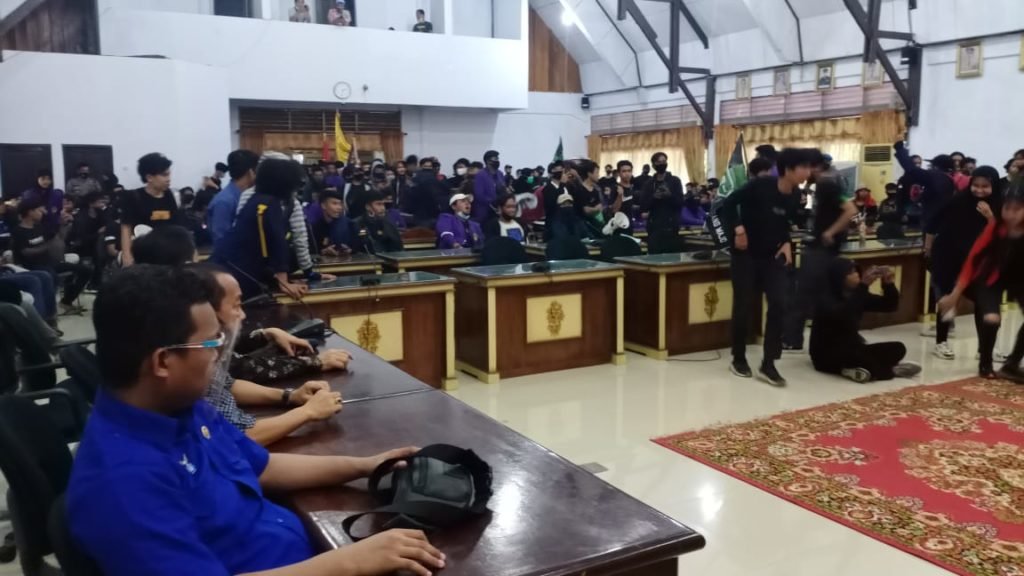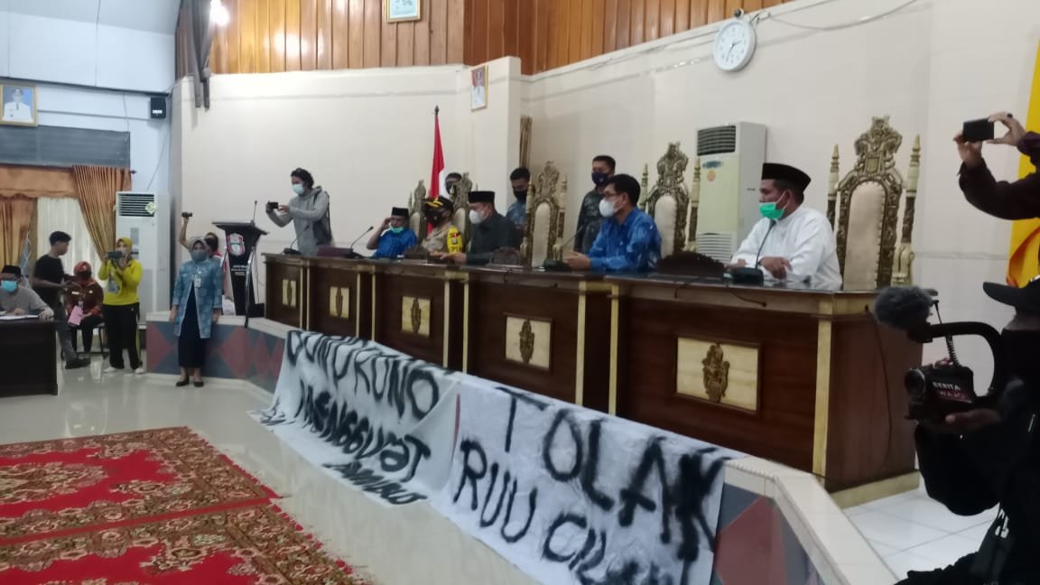 Perwakilan Aliansi Mahasiswa Pemuda Wajo dihadapan sejumlah anggota legislatif, menyampaikan penolakannya atas pengesahan undang – undang Omnibus Law.