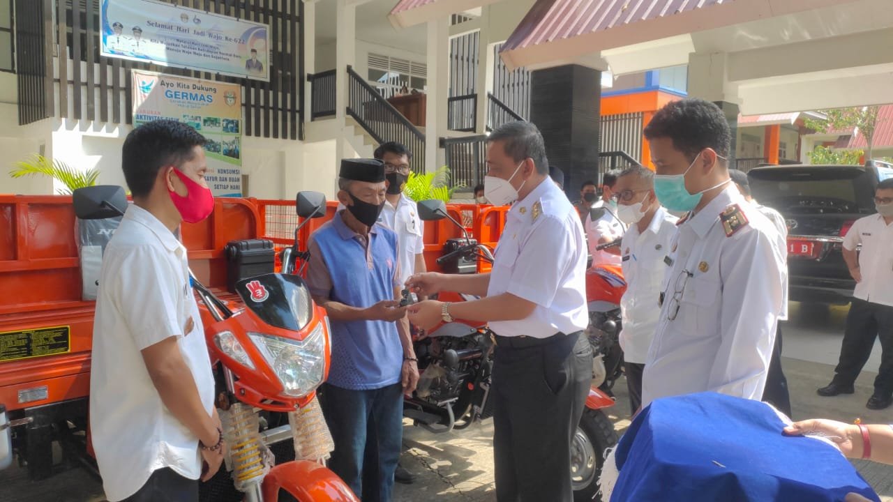 MEDIABAHANA.COM, WAJO — Guna memelihara keindahan dan kebersihan di wilayah kota Sengkang dan sekitarnya, serta mendukung Program Wajo Mapaccing, Pemerintah Kabupaten Wajo melalui Dinas Lingkungan Hidup Daerah Kabupaten Wajo, menyerahkan 4 Unit Kendaraan pengangkut sampah jenis motor kepada Petugas Operator pengangkut sampah.