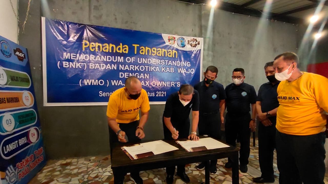 Terbaru menandatangani Memorandum of Understanding (MoU) dengan BNK Wajo, yakni Wajo Max Owner’s (WMO), Rabu (18/8/2021) malam, di halaman basecamp WMO di Sengkang.
