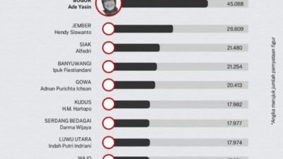 Bupati Jember, Hendy Siswanto, berada di posisi kedua dengan 28.809 pernyataan. Selanjutnya, ada nama Bupati Siak, Alfedri, dengan 21.480 pernyataan di posisi ketiga.