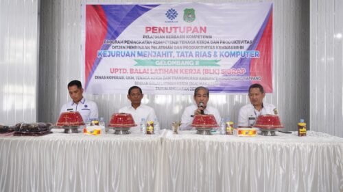 MEDIABAHANA.COM SIDRAP — Bupati Sidrap, H. Dollah Mando menutup Pelatihan Berbasis Kompetensi (PBK) di Aula Balai Latihan Kerja (BLK) Kabupaten Sidrap, Pangkajene, Kecamatan Maritengngae, Rabu (3/8/2022)