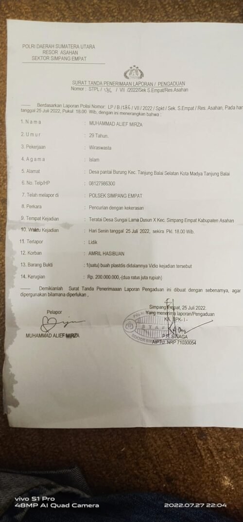 “Usai mengalami pencurian dan kekerasan tersebut, klien kami langsung melaporkannya ke Polsek Simpang Empat dan sudah menerima Surat Tanda Penerimaan Laporan / Pengaduan dengan nomor : STPL /186/VII/2022/Sek S. Empat/Res.Asahan,” terangnya.