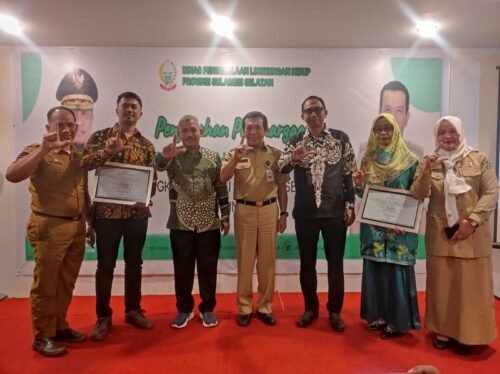 Kepala SDN 6 Arawa, Hj. Hamsiah S.Pd., dan Kepala SDN 2 Rappang, Drs. M. Tahir, M.Si menerima penghargaan yang diserahkan Kepala Dinas Pengelolaan Lingkungan Hidup Provinsi Sulsel, Andi Hasbi.