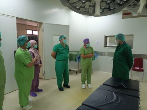 Menjaga sterilitas ruang operasi, Amran Mahmud ikut mengenakan baju kamar operasi lengkap dengan penutup kepala. Kepala daerah bergelar doktor ini beberapa saat menerima penjelasan dari petugas medis.