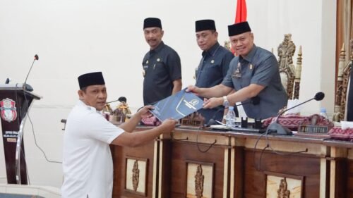 Juru bicara fraksi gerindra, H. Mustafa menyerahkan pandangan umum fraksi gerindra kepada Ketua DPRD Wajo, H. Andi Alauddin Palaguna (gus)