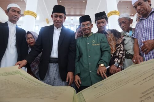 Bupati Wajo, Amran Mahmud, baru saja melakukan serah terima mushaf berukuran besar itu dari penulisnya langsung, Ustaz Usman Pabbo. Prosesinya usai pelaksanaan salat Jumat di Masjid Agung Ummul Quraa, Jumat (4/11/2022).