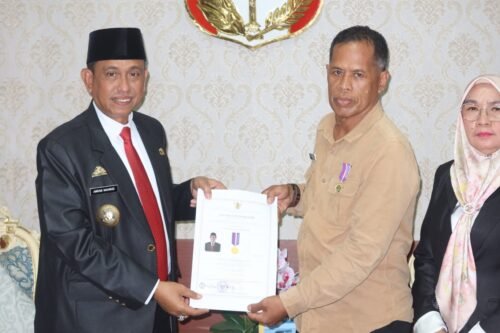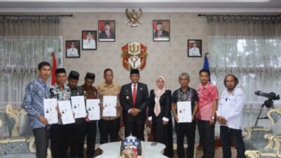 Piagam penghargaan dan lencana dikirimkan Kemendes PDTT ke Kantor Dinas Pemberdayaan Masyarakat dan Desa (PMD) Wajo, kemudian diserahkan dan disematkan langsung Bupati Wajo, Amran Mahmud, kepada kepala desa penerima di Ruang Kerja Bupati, Jumat (6/1/2023).