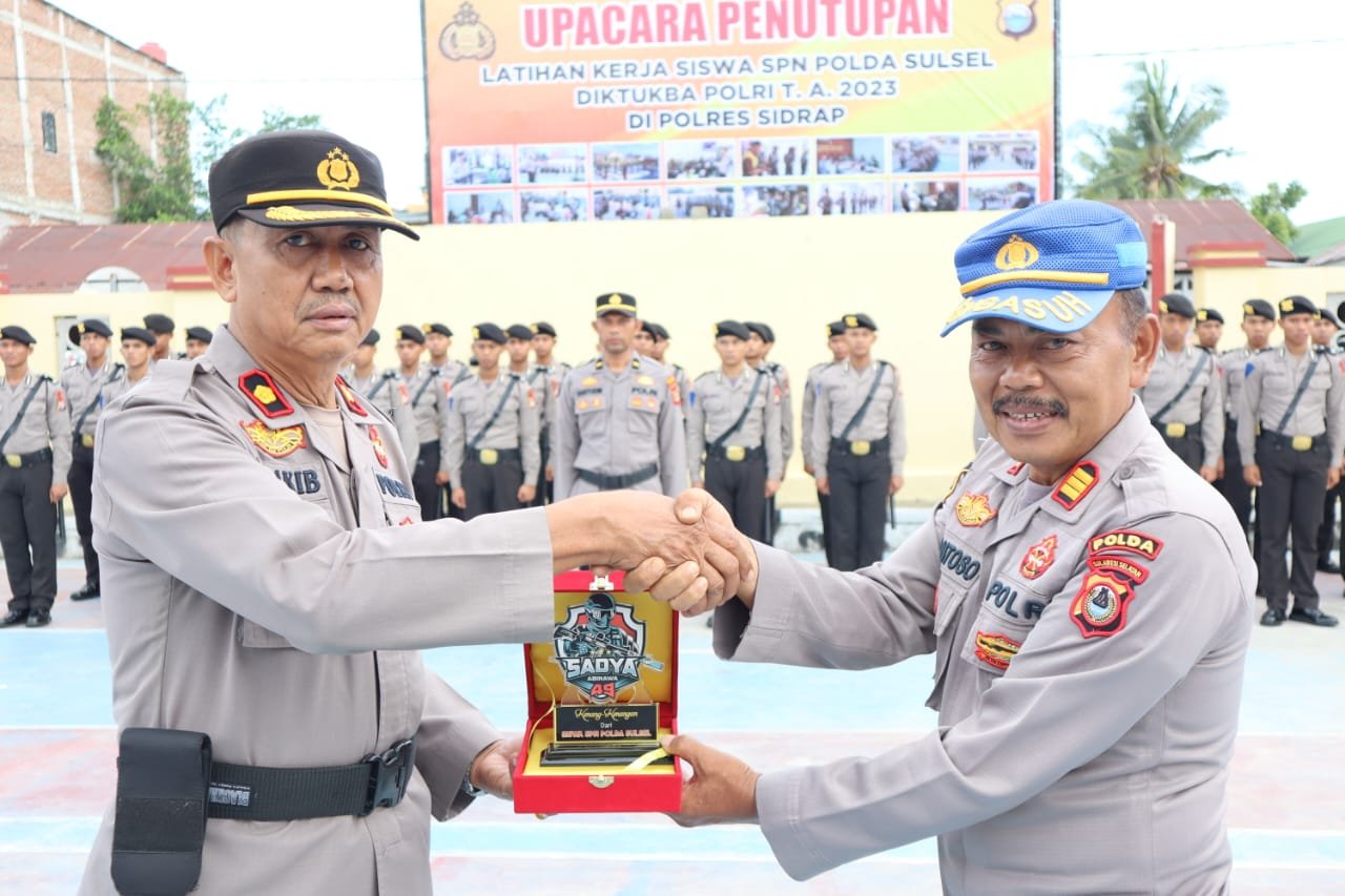 MEDIA BAHANA.COM, SIDRAP – Masa Latihan Kerja (Latja) telah selesai, Kapolres Sidrap AKBP Erwin Syah. S.I.K yang di wakili oleh Wakapolres Sidrap KOMPOL M. Akib pimpin upacara penutupan Latja Siswa Diktukba Polri Gelombang I T.A 2023 SPN Batua Polda Sulsel yang telah melaksanakan Latihan Kerja di Polres Sidrap, Sabtu (24/6/2023).