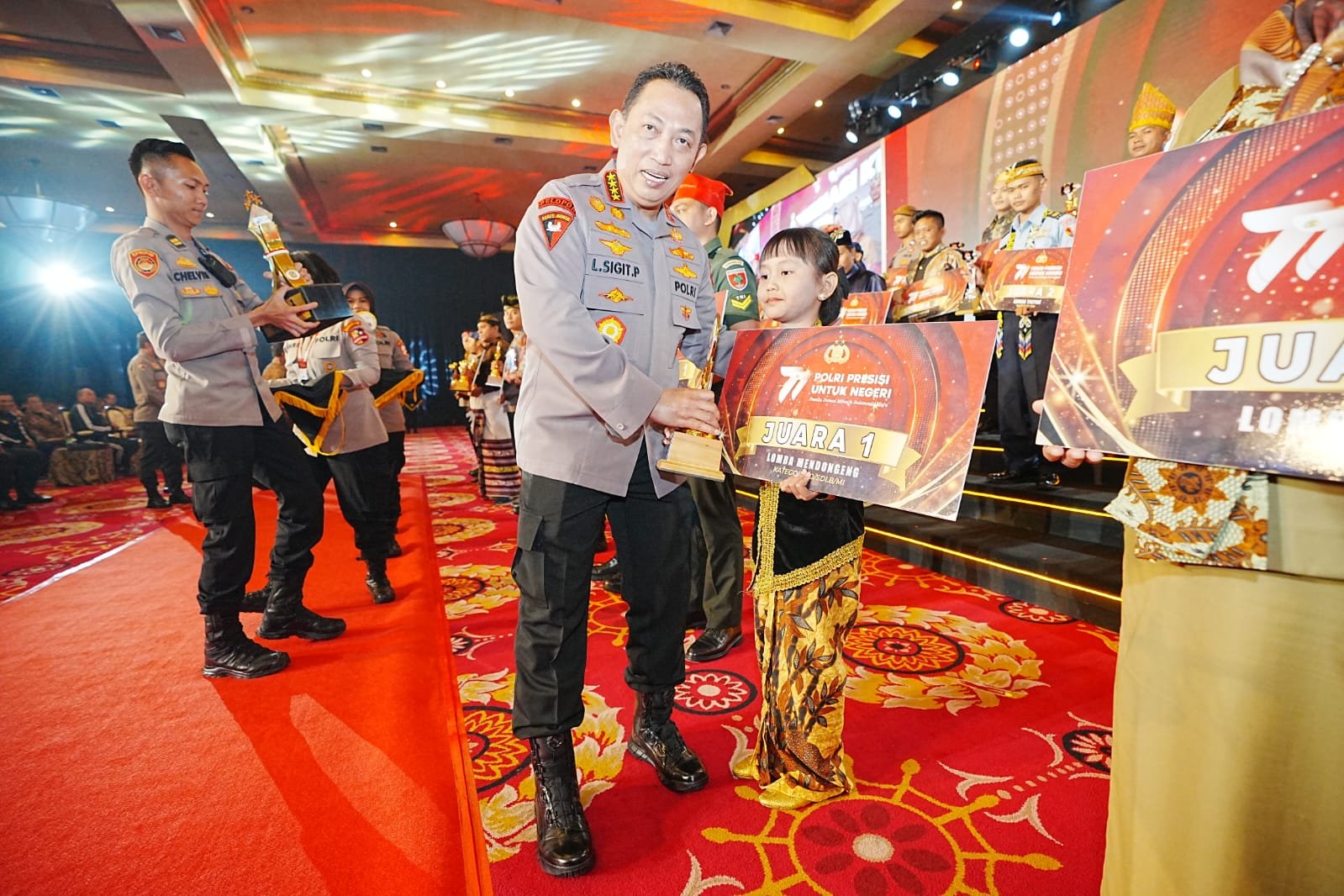 “Alhamdulillah baru saja kita melaksanakan kegiatan penganugerahan lomba kreasi terkait dengan rangkaian HUT Bhayangkara ke-77 sekaligus juga kita memberikan hadiah atau reward kepada personel-personel Polri yang berprestasi baik dalam mengharumkan nama bangsa pada saat Sea Games kemarin. Ataupun beberapa lomba internasional lainnya,” kata Sigit.