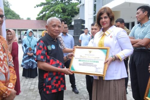 MEDIABAHANA.COM, ASAHAN – Bupati Asahan H. Surya Bsc dan Wakil Bupati Asahan bersama Forum Koordinasi Pimpinan Daerah Kabupaten Asahan dan Kepala Kantor BPJS Kesehatan Cabang Kisaran serta didampingi Asisten III dan beberapa OPD Kabupaten Asahan menyerahkan bukti kepesertaan BPJS PBI (Penerima Bantuan Iuran) APBD Kabupaten Asahan dan pemberian sertifikat penghargaan kepada 6 rumah sakit di provinsi sumatera yang bekerja sama dengan Dinas Kesehatan Kabupaten Asahan dalam hal pengobatan gratis bagi warga Kabupaten Asahan yang bertempat di halaman kantor Dinas Kesehatan Kabupaten Asahan, Senin (16/10/2023).