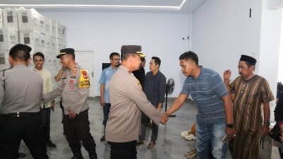 MEDIABAHANA. COM, WAJO _ Personil Polres Wajo melakukan pengamanan saat pembukaan container box dokumen hasil rekapitulasi perolehan suara Pemilu Tahun 2024 di Gudang Logistik Pemilu KPU di Sawerigading Kecamatan Tempe, Kabupaten Wajo. Jumat (26/4/2024).