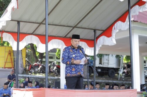 Pj Bupati Wajo, Andi Bataralifu yang bertindak selalu inspektur upacara membacakan sambutan seragam Presiden RI, Prabowo Subianto.