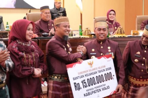 MEDIABAHANA.COM, WAJO – Gubernur Sulawesi Selatan Andi Sudirman Sulaiman memberi bantuan keuangan Rp15 Miliar kepada Pemerintah Kabupaten (Pemkab) Wajo dalam peringatan Hari Jadi Wajo (HJW) Ke-627 di Ruang Pola Kantor Bupati Wajo, Kamis (9/4/2026)